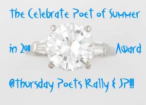 I was just awarded the Celebrate Poet of Summer in 2011 Award for my poem “A Warning” that I submitted to the Promising Poets’ Poetry Cafe website. About 100 other poets also won the same award, but having my work read and awarded by a group of other extraordinarily gifted poets is a very good feeling, indeed. I’d even say it’s an awesome feeling.