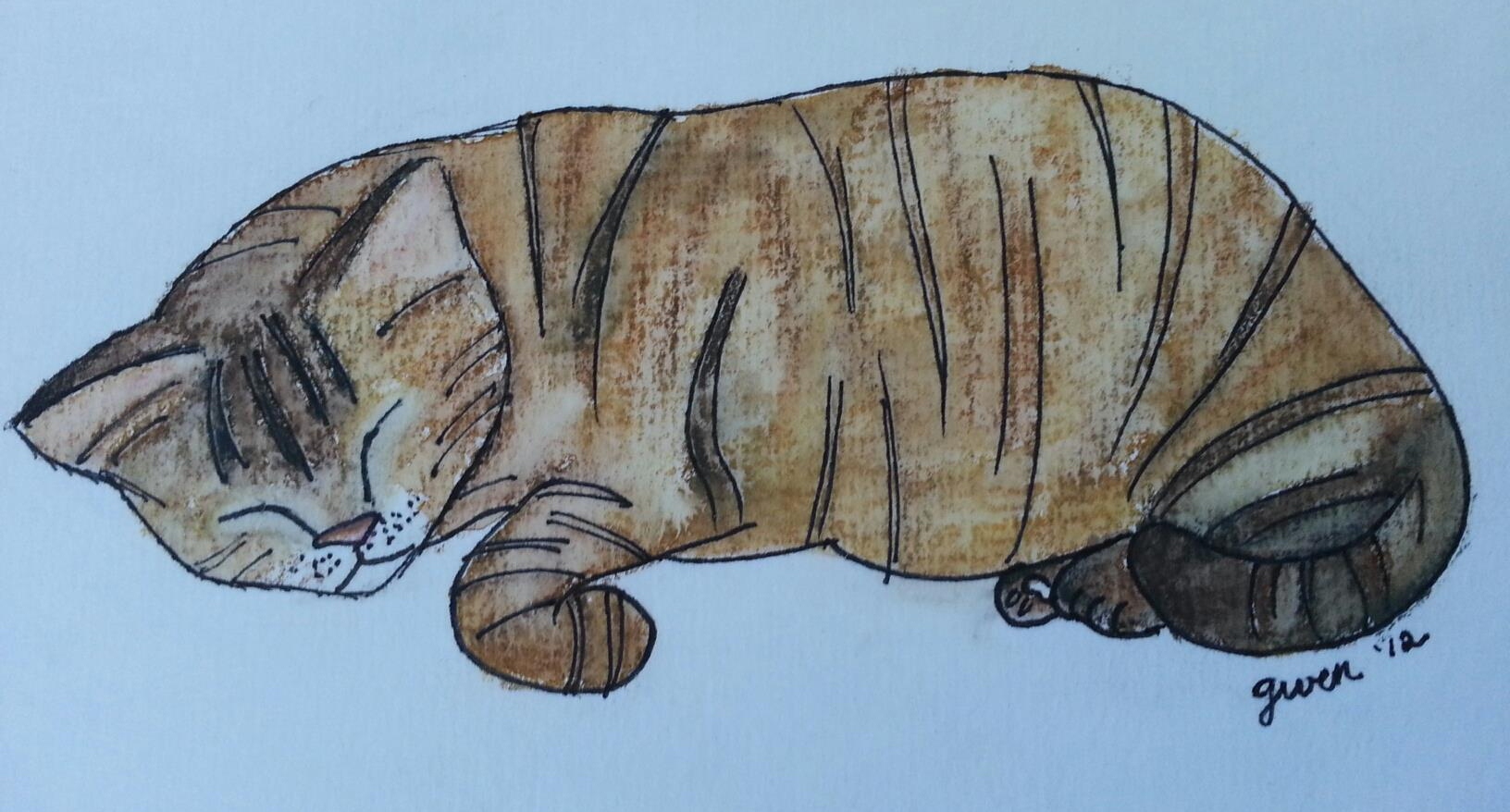 Here’s my little cat, Cinnamon. I haven’t actually tried to paint her very often because it’s difficult. She keeps licking the paint off. So I thought I’d try painting a picture of her instead.